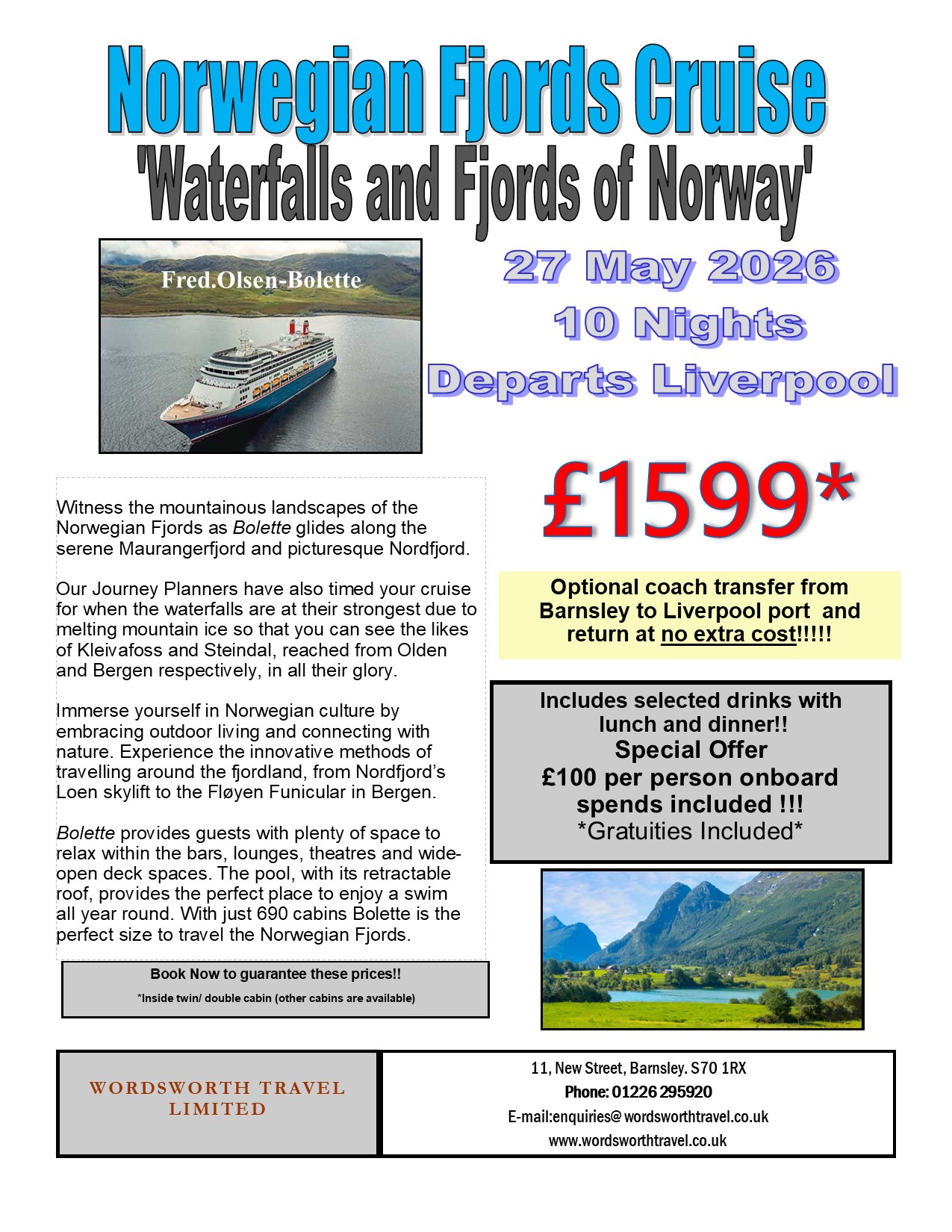Please contact our sales team to discuss your perfect holiday 01226 295920 enquiries@wordsworthtravel.co.uk