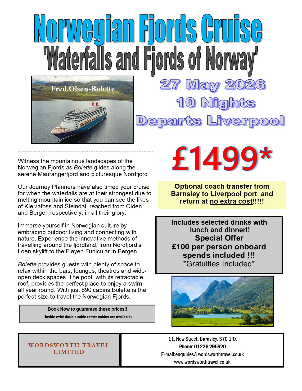 Please contact our sales team to discuss your perfect holiday 01226 295920 enquiries@wordsworthtravel.co.uk
